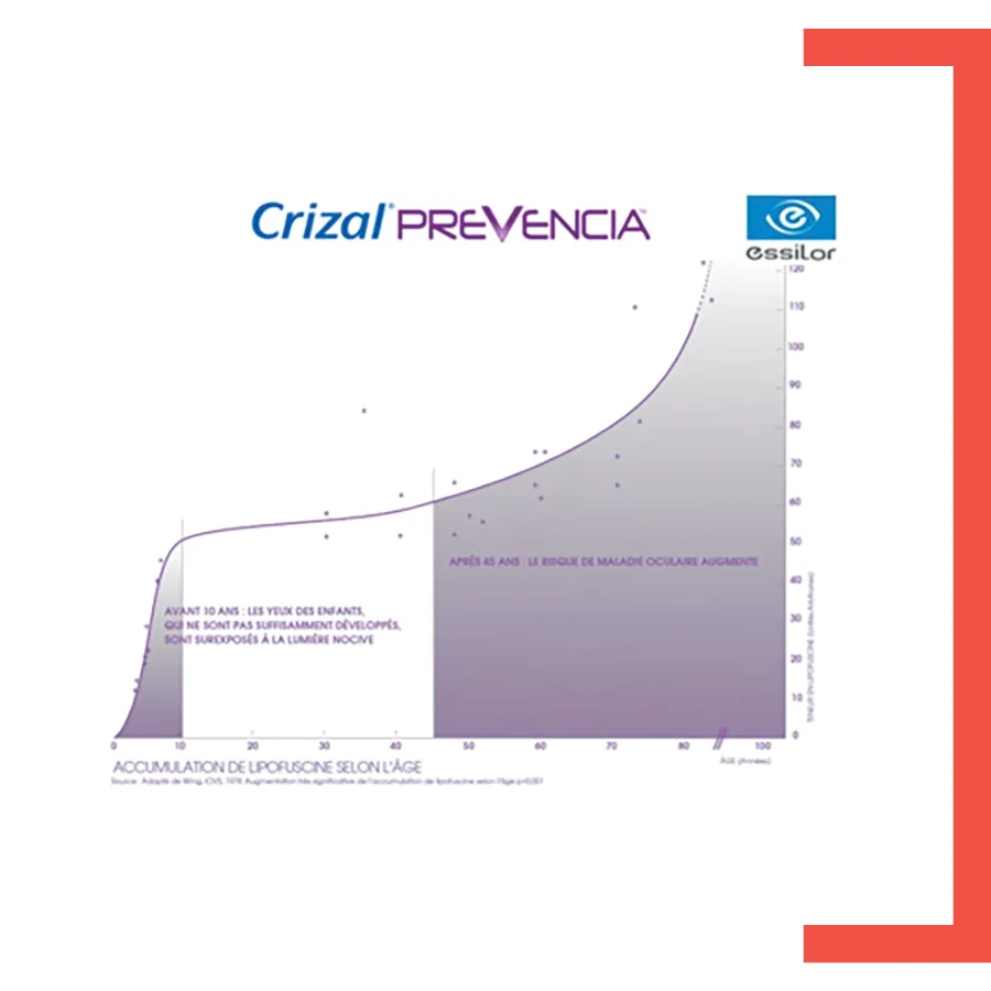 La courbe montre l’accumulation de Lipofuscine en fonction de l’âge. La lipofuscine résulte de la mort de cellules rétiniennes : plus son niveau est élevé, plus les atteintes rétiniennes sont importantes.