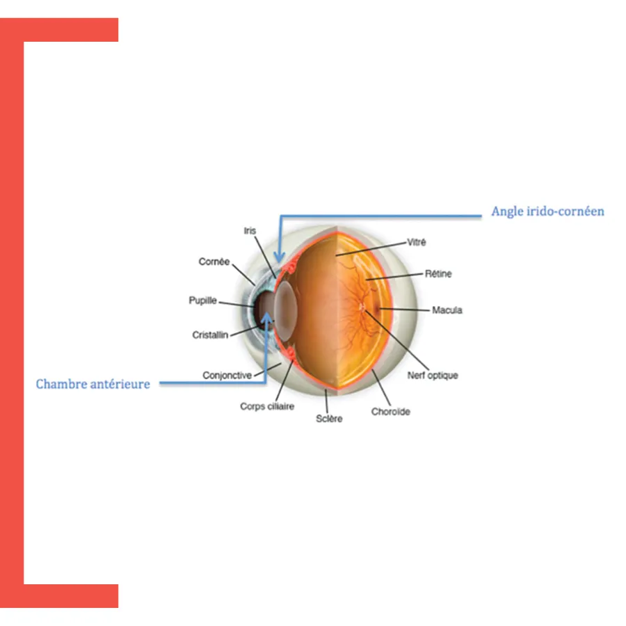 En effet, l’angle dont il s’agit est l’angle irido-cornéen (angle formé par l’iris et la cornée). C’est par cet angle que s’évacue l’humeur aqueuse, le liquide qui se trouve dans la chambre antérieure. L’humeur aqueuse sert à la fois à maintenir la pression intraoculaire, et à nourrir la cornée et le cristallin.