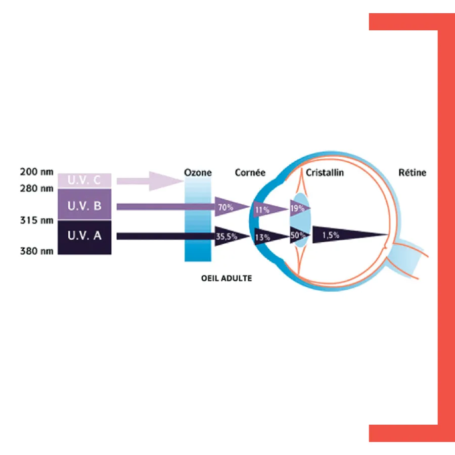 Enfin, les UV provoquent des réactions phototoxiques sur la rétine : ils sont, en autres paramètres, à l’origine de la DMLA (Dégénérescence Maculaire Liée à l’ âge).